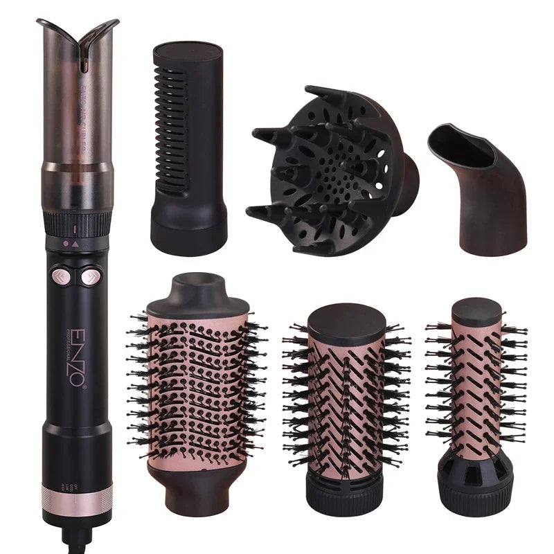 Kit multifuncional con 7 accesorios para secar, alisar, rizar y dar volumen con acabado profesional.